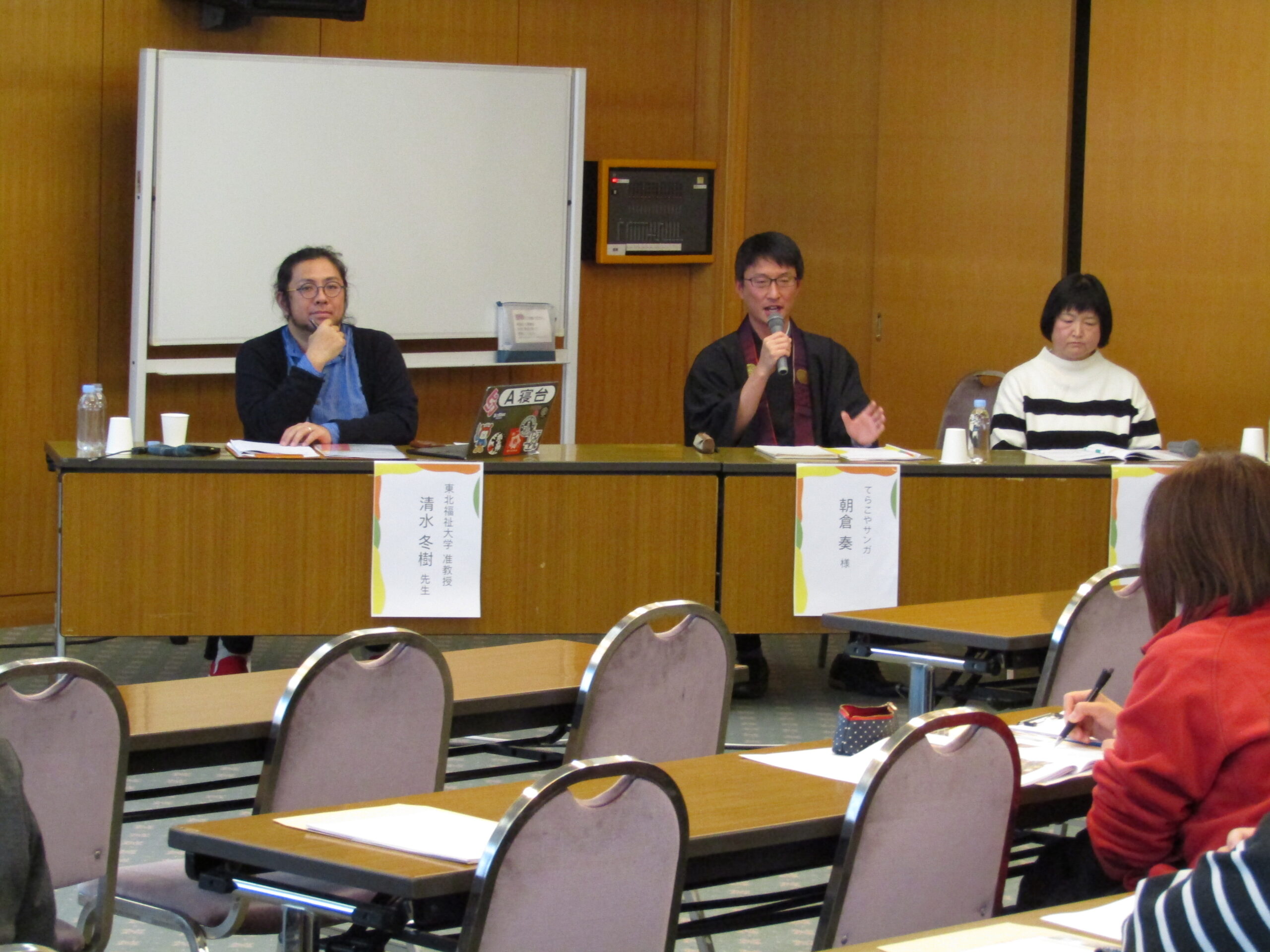 こどもの居場所を運営する当事者として、新潟市内でこども食堂と学習支援活動をしている≪てらこや食堂/無料塾TERAKOYA≫の朝倉 奏 氏、阿賀野高校で校内カフェを実施している≪阿賀野高校校内居場所カフェ A GUN≫の本間 由香里 氏、基調講演をいただいた清水 冬樹 氏にパネリストとしてご参加いただきました。