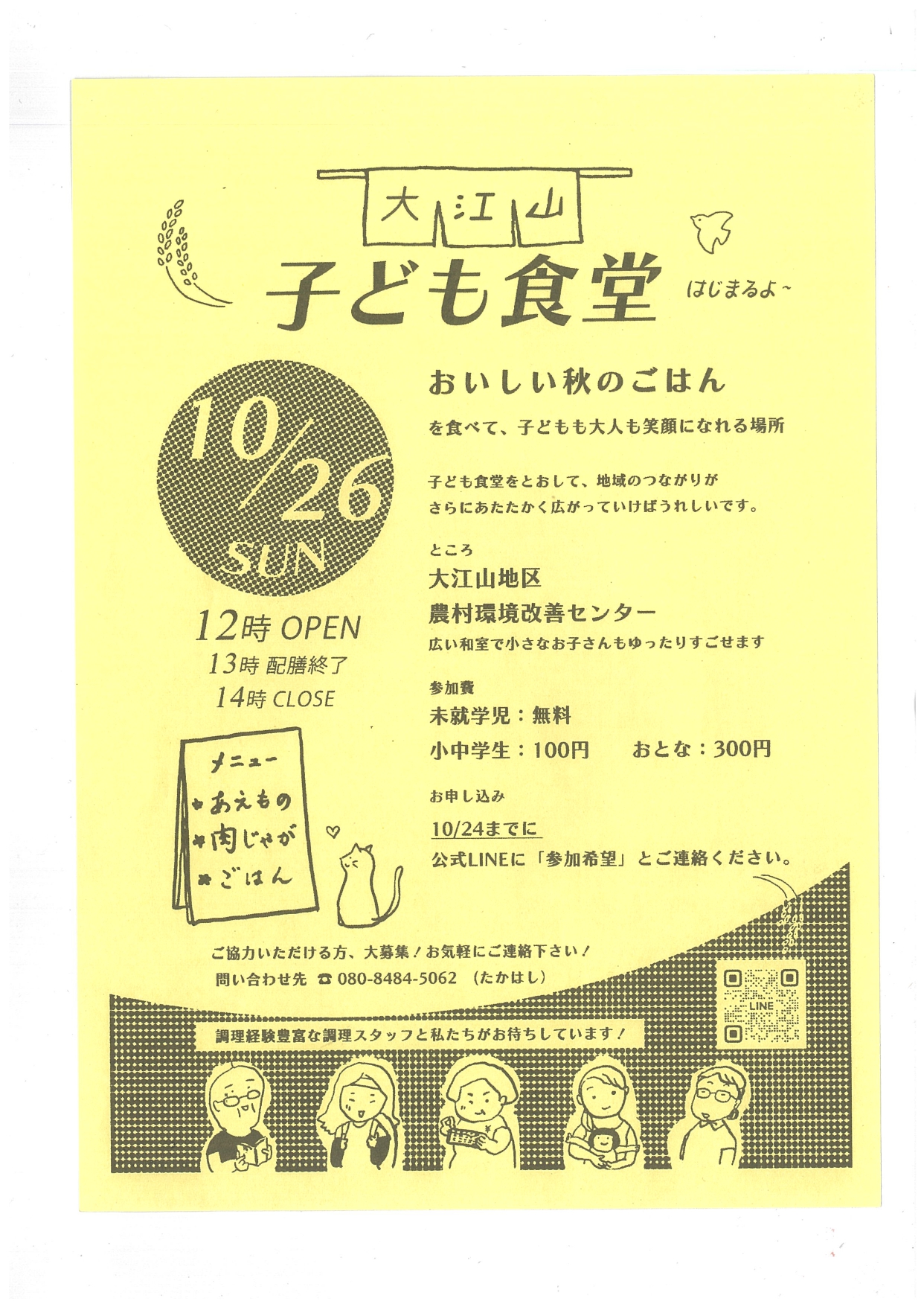 - 食事は子ども(中学生以下)100円、一般300円ですが、子どもさんに限らず、どなたでもお越しください。